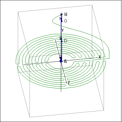 Im Demo-Beispiel Labyrinth von Chartres steht der Roboterarm zunächst senkrecht in 'Home-Position'. Bei Eintritt in das Labyrinth weist der 'End Effector' Arm G/H 'senkrecht nach unten'.